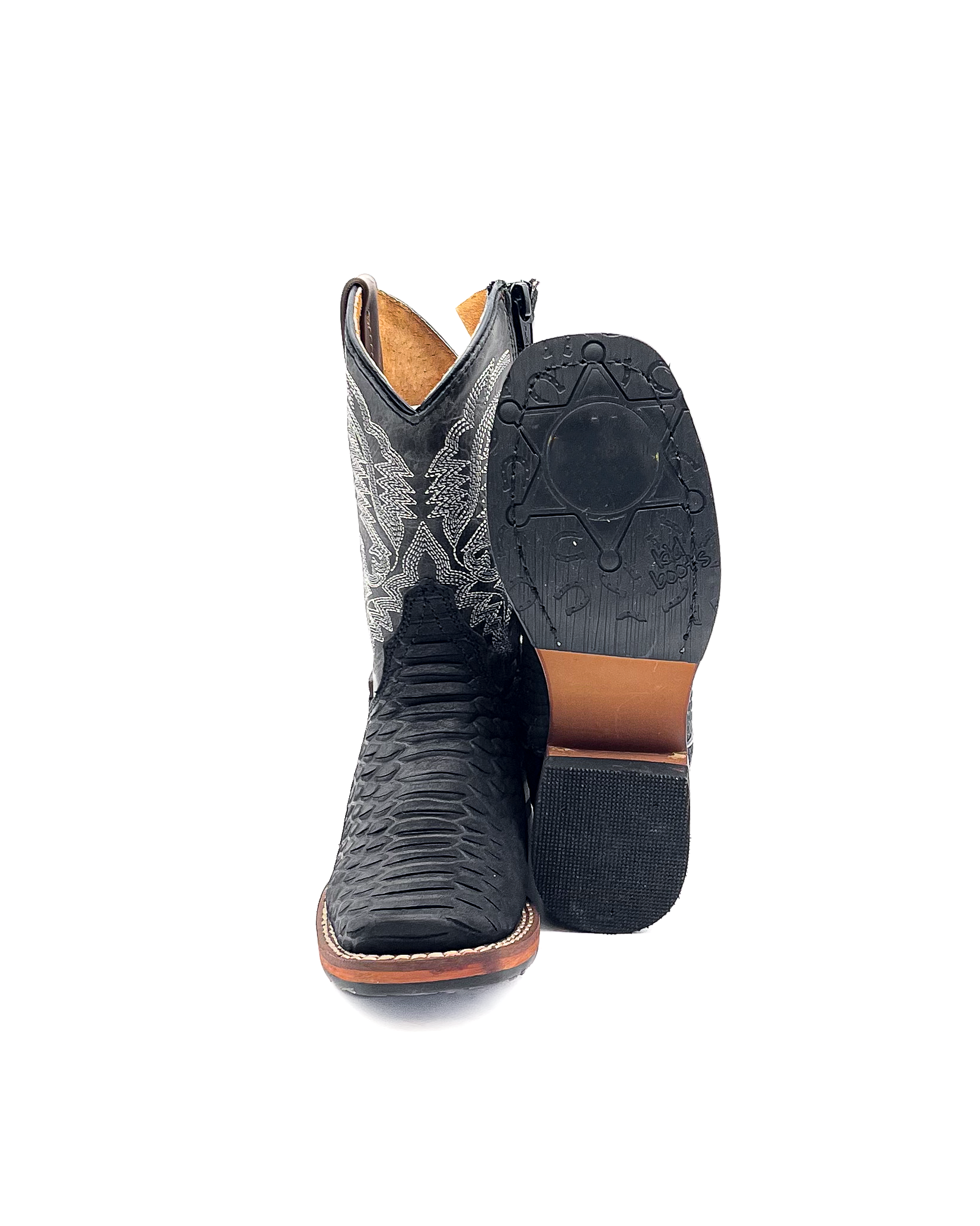 Nuestra exclusiva Bota de Niño Víbora elaborada en piel de res con grabado tipo pitón, diseñada para ofrecer un estilo western auténtico adaptado especialmente para los más pequeños. Su textura marcada y su diseño llamativo hacen de este modelo una opción ideal para uso diario o eventos especiales.