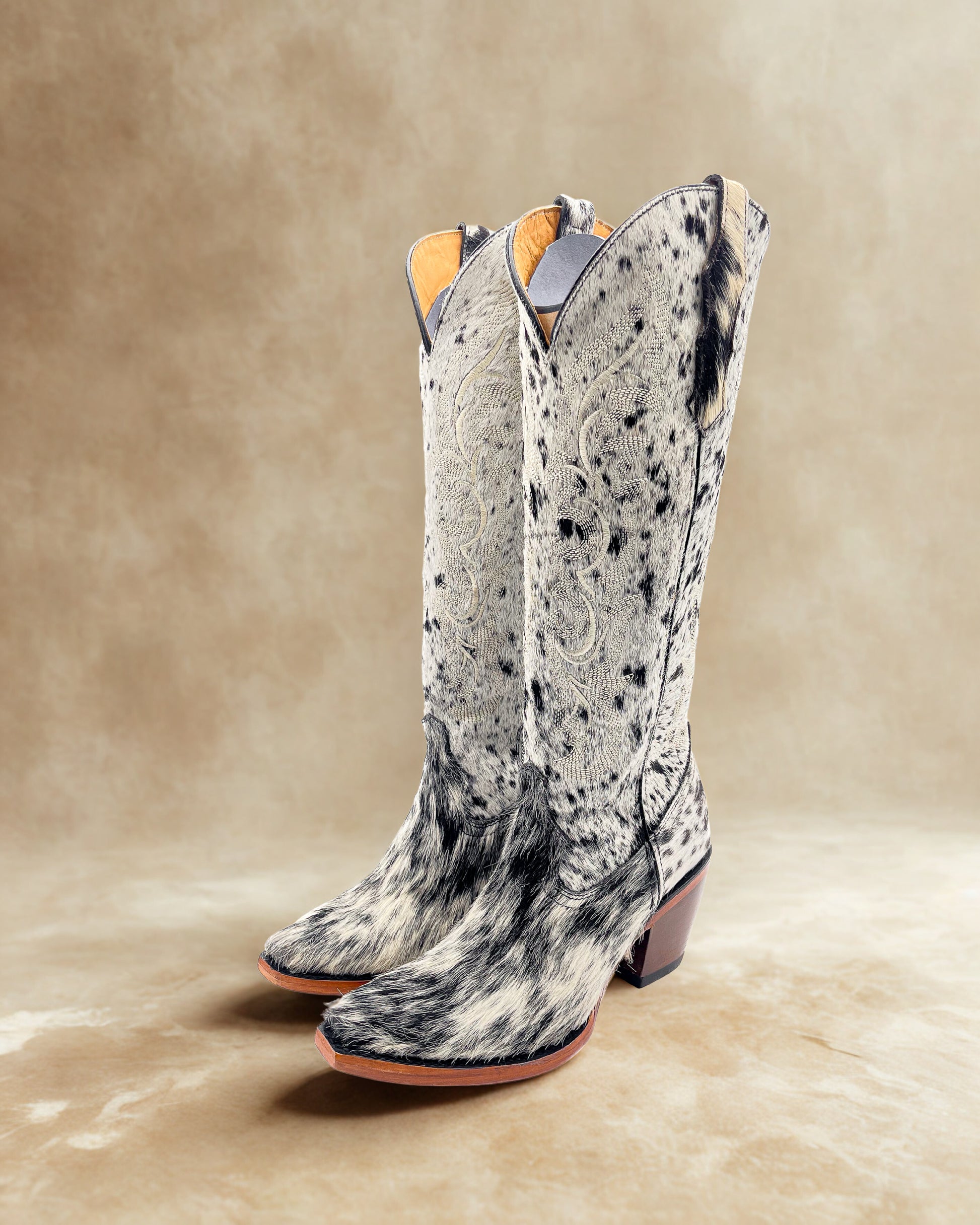 Diseñada con punta picuda, ofrece una silueta estilizada y llamativa. Cuenta con una suela en cuero genuino y construcción Goodyearwelt, además su interior está completamente forrado en piel de res, brindando firmeza, durabilidad y una sensación de calidad superior en cada paso.                                                                                                                                 Cada par de botas de pelo de vaca es único, con patrones irrepetibles que garantizan una pieza exclusiva